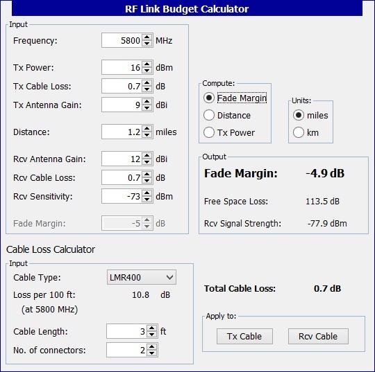 بدلیل محاسبات پیچیده ای که در مورد آخر با آن روبرو هستید اغلب کاربران از یک نرم افزار محاسب استفاده می کنند که در آن فاصله، فرکاس و نوع آنتن و کابل و حساسیت رسیور قابل تغییر بوده و خروجی مورد نظر را دریافت می کنند. برای نمونه در تصویر زیر خروجی عدد 5.8GHz می باشد.